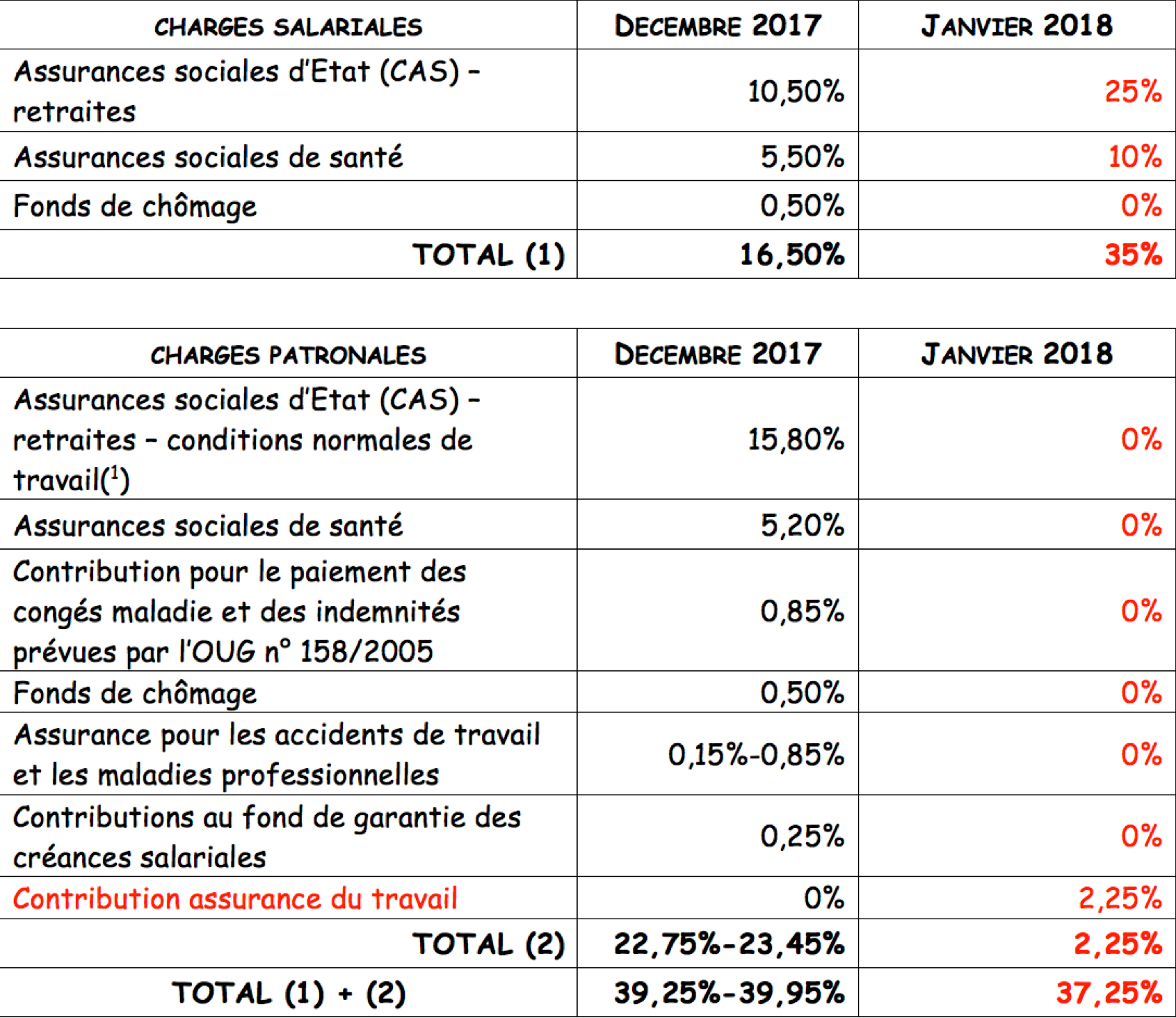 (1) A partir du 1er janvier 2018, pour le travail dans des conditions particulières, respectivement dans des conditions spéciales, l’employeur doit payer une contribution CAS de 4% du revenu brut réalisé par le salarié, soit une contribution de 8%. Jusqu’au 31 décembre 2017, le taux est de 20,8%, respectivement 25,8%